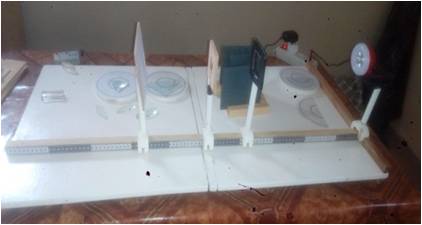 Banc optique de fabrication locale par Dr. TALLA Alain : Le banc optique de fabrication locale est un outil didactique qui permet de réaliser les travaux pratiques de l’optique géométrique (lois de Descartes, la focométrie et les lentilles, la déviation de la lumière par un prisme). Les concepteurs ont dessiné les instruments d’optique correspondants et fait fabriquer localement en utilisant l’expertise des vitriers. |
