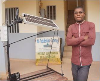 Suiveur de soleil par Dr. Hyacinthe TCHAKOUNTÉ: Il s’agit d’un appareil chargé d’orienter automatiquement les plaques photovoltaïques sur l’incidence optimale des rayons solaires afin d’optimiser la production de l’énergie électrique photovoltaïque. Mais il dispose d’une carte d’acquisition qui enregistre les différentes données de la plaque photovoltaïque (ensoleillement, température, humidité, tension électrique, courant électrique, puissance électrique et même la vitesse du vent). Ceci lui donne un caractère d’équipement utile pour les recherches sur les plaques photovoltaïques. |